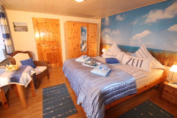 Ausstattung: Doppelbett mit guten Matratzen und verstellb. Lattenrosten, 3-türiger Kleiderschrank,  Nachttische mit Lampen,  2 Sessel, Radiowecker, Fernseher, Verdunklungsrollos. Kinderbett auf Wunsch.